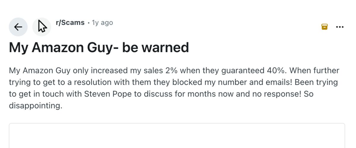 Some Reddit users claim that My Amazon Guy’s services are too expensive or not worth the investment. Many of these comments come from anonymous users who have never actually hired the agency but are simply reacting to the listed prices.